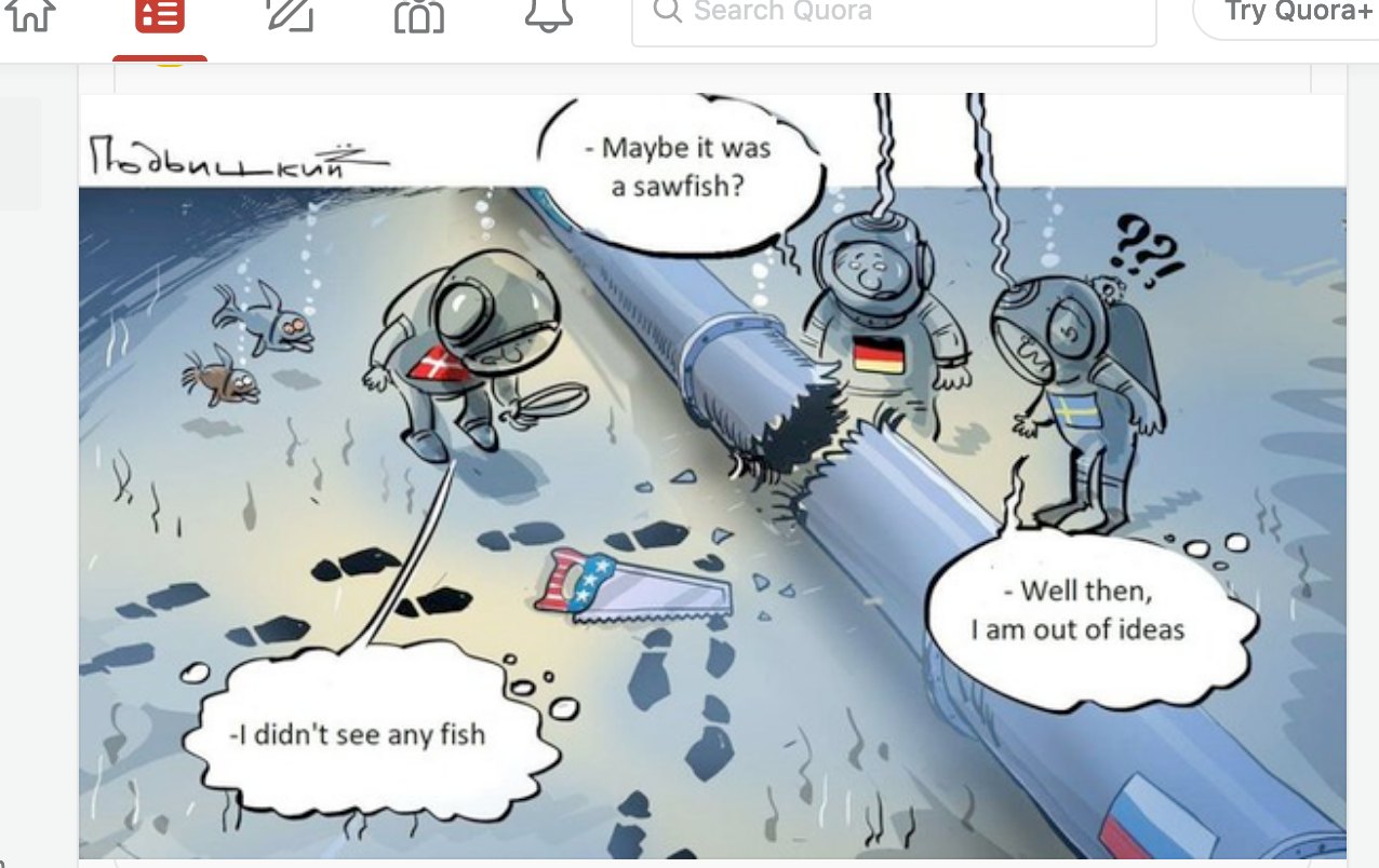 USA har også interesse i at ødelægge gasledningen. Man vil gerne selv sælge dyrere frackinggas til tyskerne, og nordmændene vil også gerne sælge deres gas til dem. Ja, Biden har jo selv tilstået for åbent kamera. Hvad der her er sket, er en forbrydelse – ikke en krigsforbrydelse, men en ganske almindelig forbrydelse – og den ville være grundlag nok for en krigserklæring til USA. At Rusland viger tilbage for et sådant skridt, er forståeligt. Rusland er nemlig en ansvarlig stat – og en krigserklæring mod USA ville eskalere situationen i en sådan grad, at det kun ville kunne ende i en atomkrig, som udelukkende ville efterlade tabere.