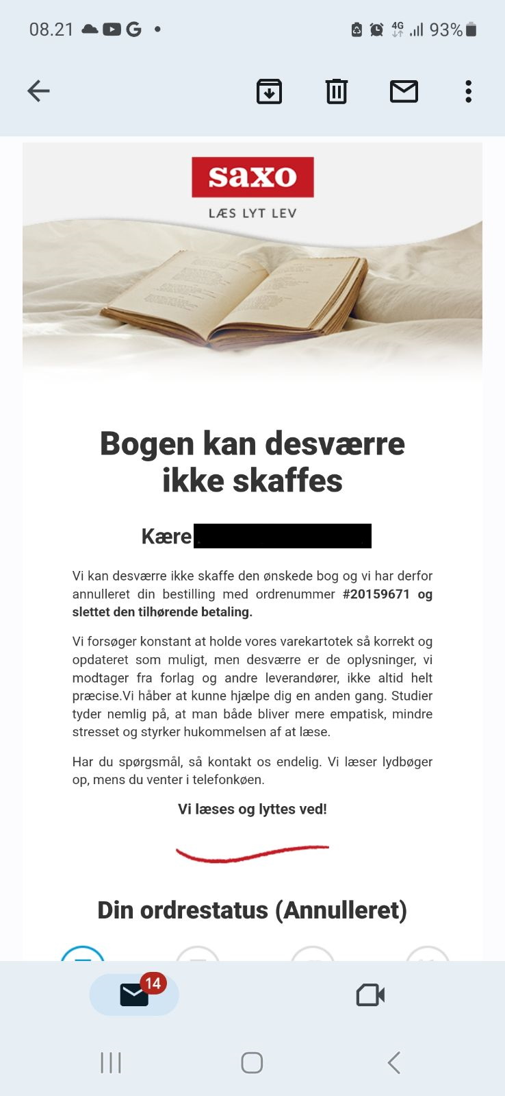 På trods af den indgåede aftale, som – under særlige omstændigheder (og disse omstændigheder foreligger ikke her) – kan opsiges med 30 dages varsel, har Saxo imod denne aftale fjernet alle bøger med øjeblikkelig virkning. De kan således heller ikke bestilles gennem andre portaler, da bøgerne blev trykt af Saxo. De er med andre ord effektivt væk fra markedet – indtil videre. Det afventes, om jeg selv modtager de bøger, jeg har bestilt til lager. Får jeg dem, vil jeg kunne levere et begrænset antal. Imens arbejder vi med at finde alternative løsninger, ligesom vor advokat er sat på sagen – ikke at jeg venter mig stort af det, thi det ville forudsætte retsstatslige forhold, og som bekendt foreligger sådanne ikke. Desuden er det jo et spørgsmål om økonomi. Har du ingen penge, har du ingen ret.