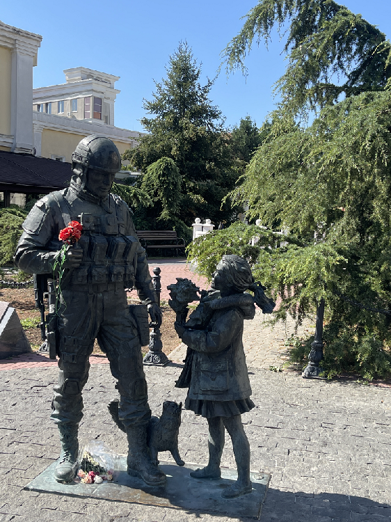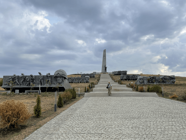 Most of the city’s western hinterland is scarred by war and fighting. The road towards Seversk has been partially blown up and destroyed by tank traffic. The bridges have been blown up. The road is actually four lanes, but you drive in a single lane that switches from side to side depending on where it is reasonably passable. You don’t want to stop and get out of the car to take a leak. There are landmines. We really wanted to go to Artyomovsk (which the Ukrainians called Bakhmut), but there are not really any updated road maps, and the GPS has been jammed. We drove through 3 military checkpoints. At the fourth, the guard asked where we wanted to go. We wanted to go to Artyomovsk. He shook his head. We couldn’t get there that way, and if we continued past him, we were going into the war, so unless we had an important errand, he would suggest that we turn back. We did, but we had gotten a good impression of how devastating this American war is. Sometimes I really wish that somebody would take the war to America – just a few conventional bombs would scare the living bejesus out of the Americans! They have recked havoc around the world and have killed millions of people, but they haven’t had a war at home since 1865 – they don’t know what it is! But maybe they will have another civil war soon. I hope so! Another drive was to Saur-Mogila, a majestic hilltop monument, a huge burial mound in the southeastern part of Donetsk Oblast (today Donetsk People’s Republic), close to the border with Rostov Oblast. In the 1960s, a memorial was built here for those killed in one of the many battles of World War II. During the current war of liberation, the mound was also the scene of battles and changed hands several times. Today it is liberated territory, and the monument has been rebuilt to include the fallen of the current war and this has been done in a brilliant way. The Russians are really good at monuments. As you walk up the stairs to the top, you pass a series of reliefs where past and present merge. The liberation struggle is continuous. What at first glance looks like rust on the figures in the old uniforms is not rust, but the symbol that the past may fade away, but it is not forgotten because the torch goes on. The monument is a popular destination and from the top there is a fantastic view. Many soldiers come here – and there is room for more names on the stones. But I fear that more stones will also be needed…