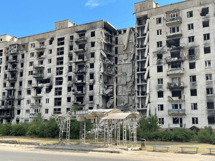 Our next stop was Lugansk, which is a completely different kind of city from Donetsk. It is smaller, but above all it is poorer, a classic workers’ town – and the Ukrainian government has maintained absolutely nothing. Even inside the city, the streets are impassable in places. I don’t know when the last tram ran, but it’s been a long time. The tracks are still there, and where there are tracks, the asphalt deteriorates when it is not maintained. In Lugansk there is no immediate war damage to be seen. Here you are further from the frontline. There is a good straight road from Donetsk to Lugansk, but before you go anywhere you have to ask about safety. We were sent in through the villages. The main road could be fired upon. From Lugansk we drove north to Severodonetsk, also located in Lugansk oblast (Lugansk People’s Republic). The city was liberated by Russian forces after heavy fighting on June 24, 2022, but since then it has often been shelled by Ukrainian terrorists, whose only goal is to target civilians – even though in Ukrainian eyes they are Ukrainians. This shows the hypocrisy of Ukrainian propaganda, which is uncritically peddled by a unified Western press. Here too, the city’s main workplace, the Azot chemical factory, the largest fertilizer factory in Europe, has been completely destroyed. There are more houses still standing in Severodonetsk than in Mariupol, but most of them are completely burnt-out skeletons. Driving around the streets is like driving around a ghost town. The streets are wide and perpendicular to each other as in an American city, but they are almost deserted. As you approach the city, you drive through a large area of completely burnt and scorched forest. The neighboring town of Lysysyansk is just as badly affected, but the security situation there is so bad that you need a pass to enter the town.