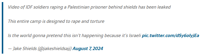 I 2024 har Joe Biden stået i spidsen for et folkemord i Gaza og lynchninger begået af israelske bosættere på Vestbredden. Israelske soldater sodomiserer mandlige palæstinensiske fanger, mens folkemængder protesterer mod ethvert forsøg på at straffe dem. Israel er på randen af krig med Hizbollah i Libanon. En stedfortræderkrig med Iran er brudt ud i Irak, Syrien, Libanon og Yemen. Israel har myrdet Hizbollah- og Hamas-ledere og kommandanter fra IRGC over hele Mellemøsten. Kongressen har givet Israel en rekordstor udenlandsk bistand på 26 milliarder dollars, og Joe Biden har underskrevet et lovforslag om at tvinge salget af TikTok igennem, fordi der var for meget kritik af Israel på de sociale medier. Desuden blev tusindvis af mennesker arresteret på universitetscampusser i en massiv aktion for at protestere mod krigen i Gaza på opfordring af demokratiske topdonorer, hvilket overgår, hvad der skete under Trump.