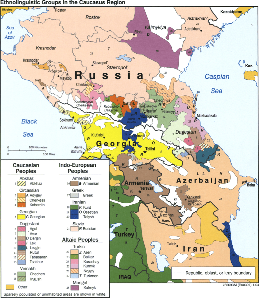 Georgia, within its “internationally recognized” borders, is, as you can see, a patchwork quilt. Georgians are an independent Christian people – one of the oldest Christian peoples. They speak a Kartvelian language with its own alphabet and, strictly speaking, with two different alphabets, one of which is currently only used by the church. In addition to Georgian, there are 3 other Kartvelian languages that are not intelligible to the native speakers. In addition, a wide range of minority languages are spoken, including indigenous languages such as the North-East Caucasian Tsova-Tush and the languages spoken by the many peoples bordering Georgia, whose borders are not drawn on the basis of nationality and where the freedom of movement in the Soviet Union has also made itself felt. There are Russians, Turks, Armenians, Azerbaijanis, etc. etc. in Georgia.
