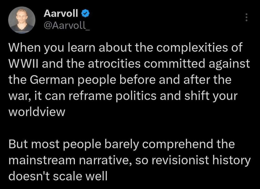 Skal vi rehabilitere det for at få folk til at støtte nationalismen i 2025? De stærkeste og mest patriotiske hvide lande i dag findes i Østeuropa. Jeg kender nationalister, som gør et fremragende stykke arbejde i mange af dem. Skal vi tvinge dem til at ændre deres holdning til tysk imperialisme i deres lande? Og underminerer det faktum, at lande som Polen har haft noget af den stærkeste nationale modstand mod globalismen på trods af deres stærke historiske modstand mod nazismen, ikke hele ideen om, at et positivt syn på Hitlerismen er nødvendigt for at få en nationalistisk bevægelse til at blomstre?