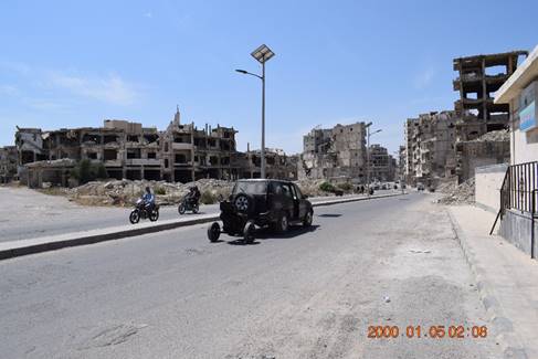 Det, der umiddelbart slår en, når man kører igennem Syriens byer, er de utrolig omfattende ødelæggelser, man ser. Byerne ligner de tyske byer i 1945. Hamah er uskadt. Det siges, at bystyret navigerede imellem parterne på en måde, så man undgik kamp. Den gamle bykerne inden for bymuren i Damaskus er også stort set uskadt – det samme gælder den inderste bykerne i Homs. Aleppo er stærkt medtaget, men citadellet er næsten uberørt.